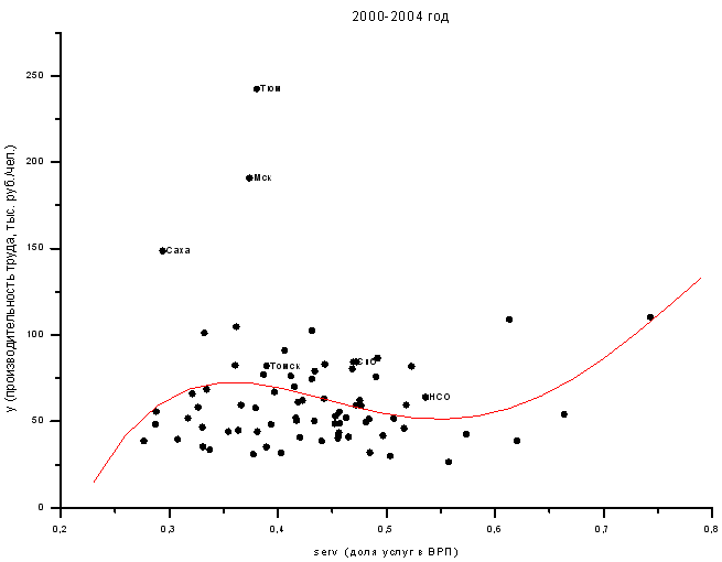 На Рисунках 4-7, приведены графики производительности труда в зависимости от рассматриваемых нами параметров. Как видно частная зависимость между эффективностью труда и рассматриваемыми факторами может иметь как линейный (Рисунки 6-7), так и нелинейный характер (Рисунки 4-5). Кроме того, видно, что Москва, Республика Саха и Тюменская область являются «особенными» субъектами, выделяющимися из общей массы регионов.