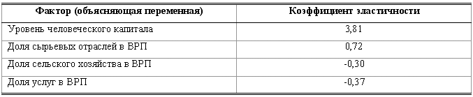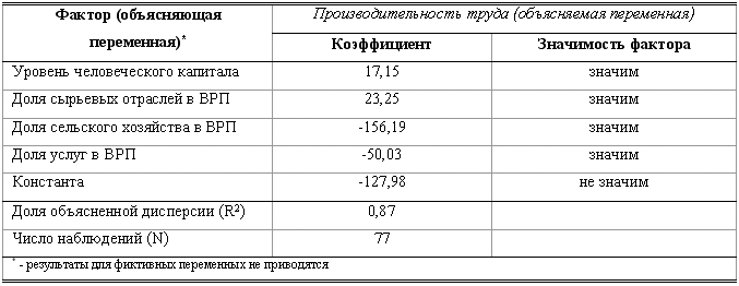 Результаты, приведенные в Таблице 2, показывают нам, насколько процентов изменится производительность труда, если величина объясняющей переменной изменится на один процент. Например, при изменении уровня человеческого капитала на один процент производительность вырастет на 3,81%. При изменении отраслевой структуры в пользу сырьевых отраслей – на 0,72% и т.д. Наиболее примечательным результатом является то, что именно уровень человеческого капитала оказывает на производительность труда наибольшее влияние. Хотелось бы отметить, что увеличение человеческого капитала на один процент в рамках полученных результатов означает, что число лет обучения рабочей силы должно вырасти в среднем всего на 1,5 месяца. Это кажется вполне посильной задачей при соответствующей мотивации и возможности доступа к образованию.