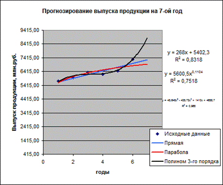Прогноз показателя выпуска продукции на 7-ой год методом экстраполяции