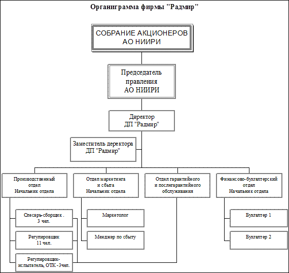 Реализация инновационного проекта производства КРМЦ «Мадис» идёт в рамках организационной структуры фирмы «Радмир» (см. Приложение А), осуществляющей проведение научно-исследовательской работы, изготовление, маркетинг, сбыт и техническое обслуживание медицинской аппаратуры.