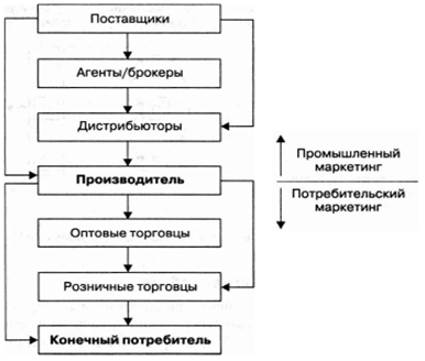 В сфере потребительских товаров преобладают длинные каналы распределения, включающие сразу несколько посредников. Обычно это оптовые и розничные торговцы. На рынках товаров производственного назначения каналы, как правило, короче, особенно если покупатели известны и представляют собой крупные организации.