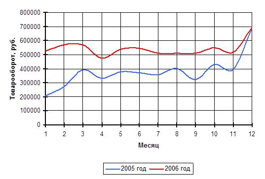 Предприятию необходимо использовать имеющиеся резервы для удовлетворения сезонных потребностей покупателей к 2008 году, т. е. увеличить запасы соответствующих товарных групп к концу лета – началу осени. Такую политику предприятие уже начало активно использовать в 2006 году и её результат имел заметный положительный эффект, что отражено на графике изменения товарооборота по месяцам предприятия «Алиса у берёзки» (глава II, п. 2.2.1, рис. 2.1).