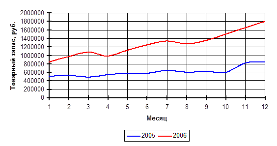 Анализ показал, что на предприятии резко увеличились товарные запасы и, следовательно, произошло понижение товарооборачиваемости. Прирост товарных запасов в 2006 году составил почти 80%. С одной стороны такая цифра говорит о рентабельности предприятия «Алиса у берёзки», но с другой стороны столь высокий показатель не соответствует приросту товарооборота, который в том же периоде составил 25%. Это вызвано тем, что в анализируемом периоде прибыль предприятия вкладывалась в расширение таких товарных групп как одежда, бельё, чулочно-носочные изделия, которые не являются предметами повседневного спроса, в отличие от товаров бытовой химии и парфюмерно-косметической продукции.