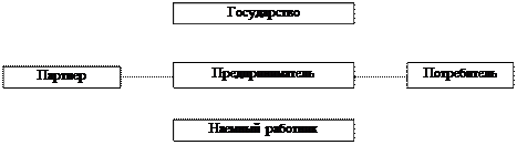 которое в различных ситуациях может выступать в качестве помощника или противника. И потребитель и государство также относятся к категории субъектов предпринимательской активности, как и наемный работник (если, конечно, предприниматель работает не в одиночку), и партнеры по бизнесу (если производство не носит изолированного от общественных связей характера) (схема 1).