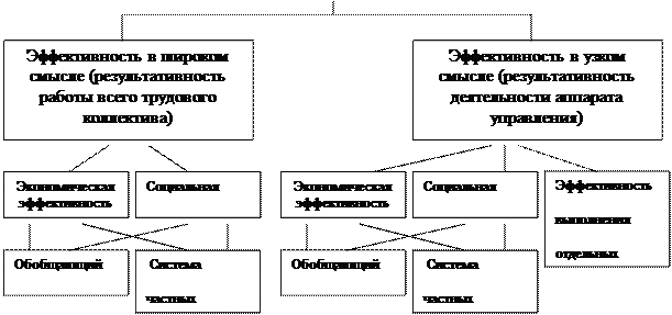 Один из известных подходов к оценке эффективности управления состоит в использовании понятий «эффективность в широком смысле» и «эффективность в узком смысле». Под эффективностью в широком смысле понимается результат деятельности, достигнутый за счет труда всего коллектива (включая работников аппарата управления). В узком смысле эффективность отражает результативность собственно управленческой деятельности. В одном и другом смыслах для характеристики эффективности применяются обобщающие показатели и система частных показателей экономической и социальной эффективности. Последовательность проведения расчетов в рамках данного подхода показана на схеме (рис. 1).