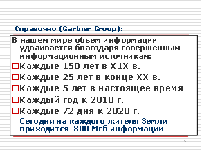 Именно поэтому в результате технологической революции в области переработки информации сам объем информации начал катастрофически быстро расти, но соответствующего роста знаний не происходит
