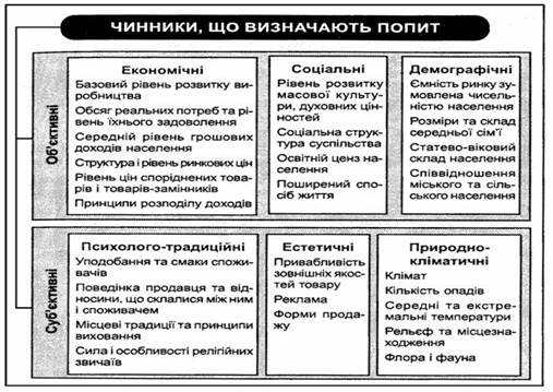 Попит виражає сформовану на ринку потребу в життєвих засобах, що визначається кількістю товарів і послуг, які споживачі можуть придбати за цінами, що склалися на ринку, та наявністю коштів