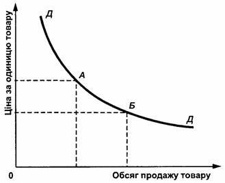 Якщо ціна товару зростає від точки Б до точки А, обсяг продаж скорочується. Напрям стрілок на осях графіка зміниться на протилежний, якщо ціна знизиться в напрямі від точки А до точки Б. Будь-якій точці на кривій попиту ДД відповідає певне значення двох змінних — Р і Q.