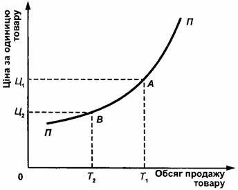 Точка А на кривій пропозиції ПП (рис. 3) показує більш високий рівень ціни Ц, який склався на ринку, і обсяг товарів Т, який також зріс. Точка В відбиває ситуацію, яка змінилася: зниження ціни до рівня Ц2, якому відповідає скорочення пропозиції до продажу товарів Т2. Отже, з рис. 29 видно, що пропозиція товарів має вигляд кривої з позитивним нахилом, що відображує залежність між двома змінними — ціною товару і його кількістю або обсягом для продажу на ринку.