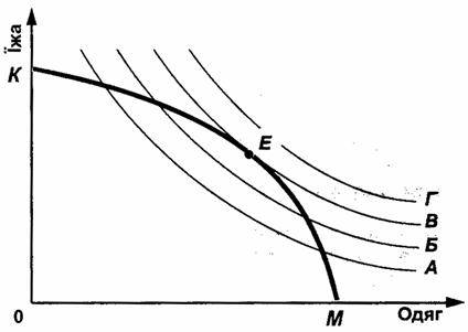 На рис. 4 показана альтернатива споживчого вибору між двома групами товарів — їжею та одягом. Лінія споживчого бюджету — це крива KM. Криві байдужості позначені пунктирними лініями А, Б, В, Г. Точка рівноваги в споживанні — Е, де крива байдужості В торкається з лінією бюджетного обмеження. Криві байдужості (їх ще називають кривими однакових можливостей) показують всі комбінації споживання їжі та одягу, які мають для споживача однакову сукупну корисність. Криві А і Б розташовані нижче кривої споживчого бюджету і свідчать про неповне споживання товарів цієї групи. Крива байдужості /^проходить за межами кривої бюджетного обмеження, тобто споживання на цьому рівні перевищує можливість доходу і особистого бюджету цього споживача.