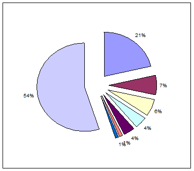 (примечание: стимулирование сбыта 21%, дизайн 7, прямая почтовая реклама 6, связи с общественностью 4, выставки, ярмарки-4, маркетинговое консультирование 1, спонсорство-1, реклама - 54).На рисунке 1 приводятся данные, характеризующие структуру маркетинговых затрат. Видно, что второе место по величине занимают затраты на стимулирование сбыта. Причем тенденция последних лет в этой области заключается в увеличении затрат на стимулирование сбыта по сравнению с затратами на рекламу. Одна из причин, объясняющих эти изменения, заключается в трудности оценить эффективность рекламы, в то же время методы стимулирования продаж, включая и не совсем легальные, направлены в существенной мере на конкретных людей – торговых агентов, руководителей организаций оптовой и розничной торговли. Оценить эффективность подобных затрат можно с гораздо более высокой точностью.