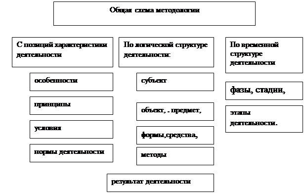 1. Методология вообще долгое время рассматривалась дословно лишь как учение о методах деятельности (метод и «логос» – учение). Подобное понимание методологии ограничивало ее предмет анализом методов (начиная с Р. Декарта). Сложилась классическая для того времени психологическая схема деятельности: цель – мотив – способ – результат. Цель задавалась человеку как бы «извне» – ученику в школе учителем, рабочему на заводе начальником и т.д.; мотив либо «навязывался» человеку также извне, либо он его должен был сам себе сформировать (например, мотив – заработать деньги, чтобы прокормить себя и свою семью). И, таким образом, для большей части людей для свободного проявления своих сил, для творчества оставался только один способ: синоним – метод. Отсюда и бытовавшее узкое понимание методологии.