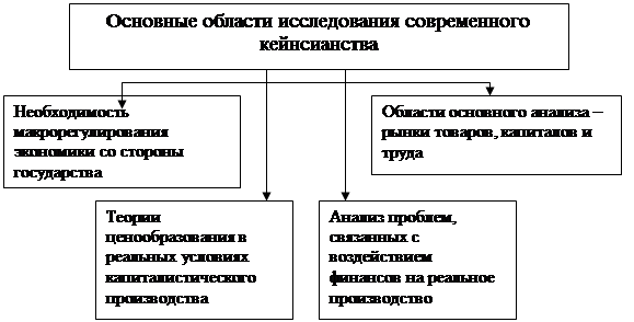 Сторонники современного кейнсианства исходят из того, что в капиталистическом хозяйстве существуют устойчивые причины, способные вызвать болезненные отклонения от стабильности роста и полного использования ресурсов, а поэтому необходимо вмешательство государства для их корректировки. Современное кейнсианство уже нельзя назвать макроэкономической теорией эффективного спроса. Акценты смещены на другие области анализа, связанные в первую очередь с функционированием рынков-капиталов, товаров и труда. Основное внимание уделяется анализу проблем, порождаемых активным воздействием финансовой сферы на ход реального производства.