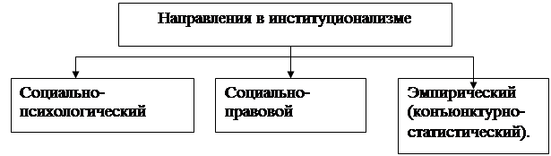 В институционализме выделяют три основные направления, обозначившиеся в конце XIX века: институционализм социально-психологический, социально- правовой и эмпирический (конъюнктурно-статистический).