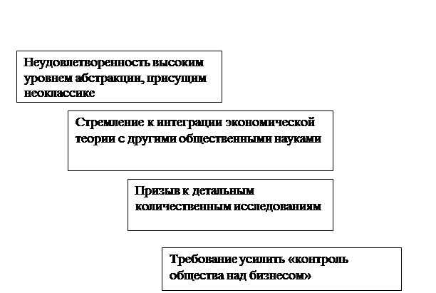 Понятие “институционализм” включает два аспекта. Во-первых, это обычаи, традиции, нормы поведения, принятые в обществе, - «институции». Во-вторых, это закрепление норм и обычаев в виде законов, организаций, учреждений, то есть “институтов”. Институты – формы и границы деятельности людей. Они представляют политические организации, формы предпринимательства, системы кредитных учреждений. Это налоговое и финансовое законодательства, организация социального обеспечения, связанное с хозяйственной практикой. Институциональный подход означает анализ не только экономических категорий и процессов в чистом виде, но и институтов, внешнеэкономических факторов. Сторонников институционализма, как и их предшественников (историческую школу), отличает критичное отношение к привычным канонам неоклассиков.