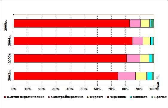 Наибольший удельный вес среди потребителей готовой продукции принадлежит России. В 2006 г. здесь реализовано 40% плиток керамических и около 7,0% санитарно-технических изделий. При этом против 2005 г. доля отгрузки плиток на российский и украинский рынок увеличилась соответственно на 14,1 и 0,8 пункта, и пропорционально на 14,7 пунктов снизилась доля реализации на внутреннем рынке. Фактически в 2006 г. ОАО «Керамин» полностью восстановило допущенное в 2004-2005 гг. снижение объемов экспорта плитки при сохранении сложившегося уровня обеспеченности внутреннего рынка за счет наращивания объемов ее выпуска.