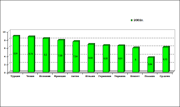 Представленные данные отражают усредненную цену продукции без выделения сортности, ассортимента и условий расчетов. Более высокая цена экспортных поставок ОАО «Керамин» отражает более высокое качество и ценовую конкурентоспособность его продукции, по сравнению с другими белорусскими производителями. Аналогично, рост средневзвешенных цен импортных поставок продукции на белорусский рынок обусловлен вытеснением с него продукции, аналогичной по своим качественным параметрам белорусской и сохранение доли рынка за наиболее дорогим, эксклюзивным ассортиментом плитки. На рис. 3 приведены цены на керамическую плитку в странах Европы, Турции и Египта, а также представлена средняя цена за квадратный метр керамической плитки.