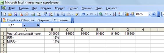 Для расчета IRR(внутренней нормы доходности) и MIRR(модифицированной нормы доходности) воспользуемся функциями MSExcel (табл.2).