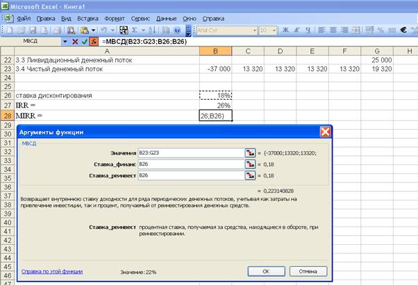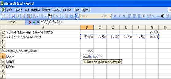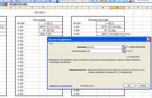 т.к. IRR больше r , т.е.19% больше 12%, то проект принимаем. В Excel расчет ВСД проводился следующим образом: