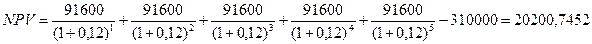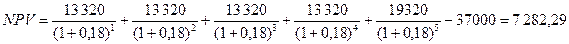 1. Чистая приведенная стоимость = -9 037,70р., значит, мы отклоняем этот проект, т.к. этот проект не принесет дополнительного дохода на вложенный капитал.