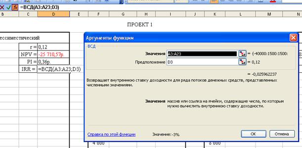 2.Внутренняя норма доходности IRR = -3%, меньше r = 12%, проект отклоняется. В Excel расчет ВСД проводился следующим образом: