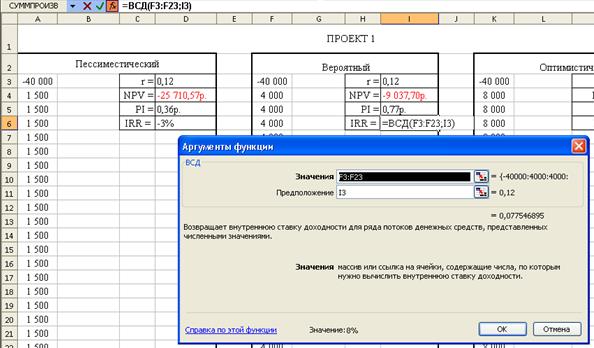 2. Внутренняя норма доходности IIRR = 8%, меньше r = 12%, проект отклоняется. В Excel расчет ВСД проводился следующим образом: