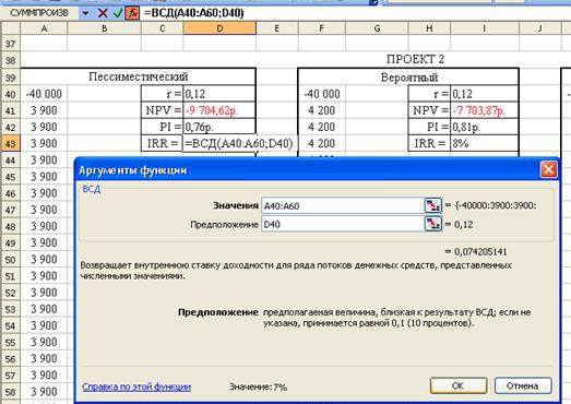 2.Внутренняя норма доходности IIRR = 7%, меньше r = 12%, проект отклоняется. В Excel расчет ВСД проводился следующим образом:
