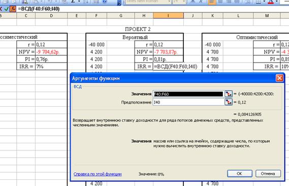 2.Внутренняя норма доходности IIRR = 8%, меньше r = 12%, проект отклоняется. В Excel расчет ВСД проводился следующим образом:
