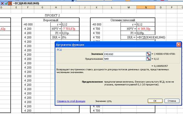 2.Внутренняя норма доходности IIRR = 10%, меньше r = 12%, проект отклоняется. В Excel расчет ВСД проводился следующим образом: