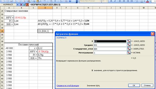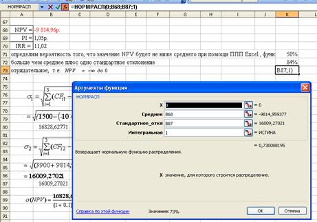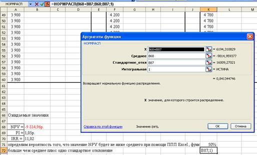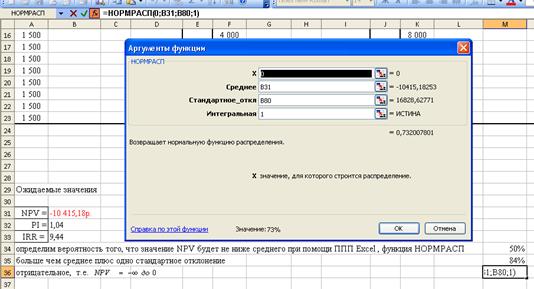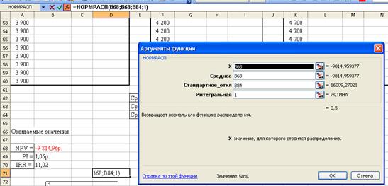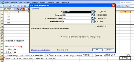 а) определим вероятность того, что значение NPVбудет не ниже среднего при помощи ППП Excel , функция НОРМРАСП Х