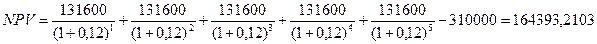 1. Чистая приведенная стоимость равна = -25 710,57р., значит, мы отклоняем этот проект, т.к. этот проект не принесет дополнительного дохода на вложенный капитал.