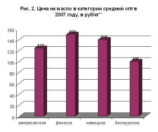 Американское масло одно из самых дешевых в оптовом звене – около 125 руб./кг за средний опт (финское — 150 руб./кг, немецкое — 140 руб./кг, белорусское — 100 руб./кг (Рис.2.). Стоимость 1 кг продукта, по данным таможенной статистики, составляет в среднем $2.