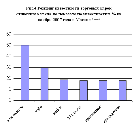 Отличительной чертой российского рынка сливочного масла также является жесткая конкуренция между производителями: крупные игроки «поглощают» мелких региональных производителей, увеличивая тем самым свою долю на рынке сливочного масла в России.Изучая потребительские предпочтения покупателей, исследовательская фирма ЗАО «Решение» в ноябре 2007 года провела опрос 1000 жителей столицы в виде телефонного интервью. На вопросы телефонного интервью давали ответы члены семьи, самостоятельно покупающие и принимающие участие в покупке продуктов постоянного спроса. Москвичей просили назвать известные им торговые марки сливочного масла и указать, масло какой марки они покупали за последний месяц чаще всего. Как показали результаты опроса, сливочное масло в ноябре 2007 года покупали 82% опрошенных. В этот раз москвичи сумели вспомнить 37 торговых марок сливочного масла – следует отметить, что это наименьшее число марок за все время проведения исследования. К примеру, в ноябре 2005 года жители столицы назвали 51 марку сливочного масла. Постоянным лидером рейтинга известности является торговая марка «Вологодское» (разных производителей). Используемый здесь показатель известности – BrainSticker – среди всех покупателей сливочного масла составляет для торговой марки «Вологодское» почти 50%. (Рис.4). Причем эта торговая марка является безусловным лидером известности на протяжении всего периода исследования, на протяжении которого ее BrainSticker не опускался ниже 37% Ближайший преследователь лидирующей марки – финский продуктово-корпоративный бренд Valio, под которым выпускается множество молочных продуктов, в том числе сыры, молоко, йогурты, сметана, даже несмотря на мощную рекламную поддержку, только два раза за весь период исследований сумел сравняться по известности с маркой «Вологодское». На ноябрь 2007 года показатель BrainStiker Valio составлял в столице 30%. Другие известные марки, среди которых Anchor (ООО «Новозеландские молочные продукты СНГ», Москва), «33 коровы» (ОАО «Очаковский молочный завод», Москва), «Кремлевское» (ОАО «Нижегородский масложировой комбинат»), «Крестьянское» (разных производителей), пока не сумели преодолеть по этому показателю отметки 20%.