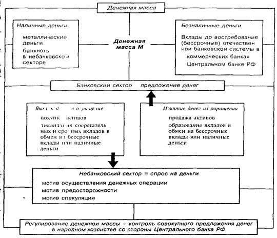 Денежная масса, которой располагает народное хозяйство для осуществления операции обмена и платежа, зависит от предложения денег банковским сектором и от спроса на деньги, т. е. стремления учреждении небанковского сектора иметь у себя определенную денежную сумму в виде наличных денег или вкладов до востребования (схема 1).