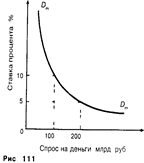 При исходной процентной ставке население и фирмы хотели бы держать на руках 200 млрд. руб., несмотря на то, что банковская система может предложить лишь 150 млрд. руб. Население и фирмы предпринимают попытки приобрести больше денег, продавая ценные бумаги. Эти действия приводят к повышению номинальной ставки процента до 12%, что обеспечивает соответствие количества денег, находящихся в обращении, количеству денег, хранящихся у населения и фирм согласно с их желаниями. Денежный рынок достигает нового положения равновесия. Уменьшение спроса на деньги запускает рассмотренные процессы в обратную сторону.