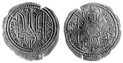 На Руси монеты появились в Х веке, они чеканились из серебра (ранее использовались деньги отчеканенные в других странах). Сохранились «серебряники» русского князя Владимира. На одной стороне изображен князь, сидящий на престоле («столе»), а на другой — родовой знак. Надпись на монете гласит: «Володимир на столе, а се его серебро».