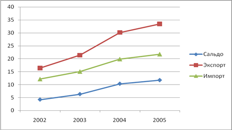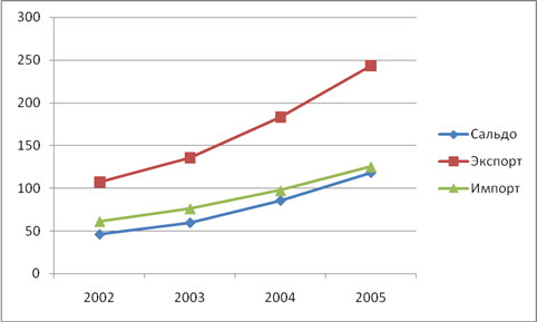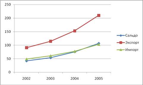 Вывод: на всех трех рисунках экспорт России преобладает над импортом, что свидетельствует о положительной динамике развития российской промышленности. Также на всех трех рисунках и импорт, и экспорт имеют положительную динамику, что говорит о том, что денежные поступления в Россию преобладают над расходами. Что касается стран вне СНГ и стран СНГ, то внешнеторговый оборот со странами вне СНГ значительно превышает объемы внешнеторгового оборота со странами СНГ. Из всех вышеприведенных данных можно сделать вывод, что сальдо (разница между денежными поступлениями и расходами) имеет положительное значение, а судя по графику, имеет также и положительную динамику.