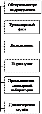 Обслуживающими подразделениями являются: транспортный флот, снабжающий добывающие суда флота продовольствиями и необходимым оборудованием; холодильник, где хранится сырье и часть готовой продукции; портопункт непосредственно принимает суда, здесь происходит и погрузка и разгрузка улова; в промышленно-санитарной лаборатории специалисты тестируют сырье и готовую продукцию в соответствие со стандартами качества и санитарными нормами; диспетчерская служба обеспечивает связь между подразделениями и судами, находящимися в промысловой зоне.