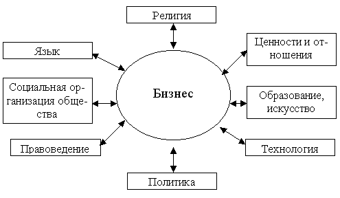 Соотношение между культурой и бизнесом в целом и ее роль в международных коммуникациях можно определить на основе рассмотрения общей культурной среды бизнеса, состав которой представлен на рис.2.