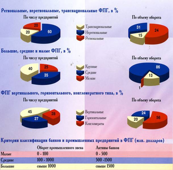 ФПГ - крупные интегральные структуры разных видов, в которых финансовые институты играют не меньшую роль, чем производственные. Они организуются как по принципу горизонтальной — объединение многопрофильных производств, так и вертикальной интеграции - по технологическим цепочкам. Создание ФПГ подразумевает объединение «под одной крышей» трех структур: финансовой — банк, инвестиционная компания, пенсионный фонд, консалтинговая фирма, брокерские конторы, внешнеэкономические, информационно-рекламные подразделения; производственной — производственные предприятия; коммерческой - внешнеторговые компании, товарно-сырьевая биржа, страховая, транспортная и сервисные фирмы.