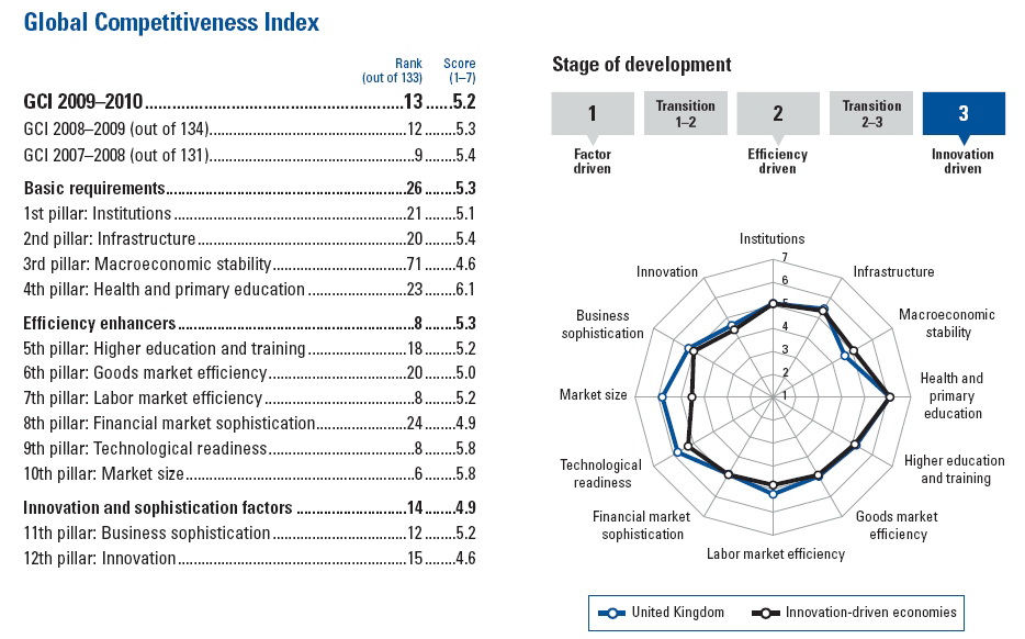 | Примечание: составлено автором [22, 23, 24, 25]. По уровню конкурентоспособности по IMD Австралия лидирует по сравнению с Великобританией и Чили, что свидетельствует о конкурентоспособности бизнеса на территории данной страны. По индексу глобализации Австралия также лидирует среди рассматриваемых стран. По индексу глобальной конкурентоспособности лидирует Великобритания. Чили уступает в рейтинге глобальной конкурентоспособности и занимает более низкие места, что свидетельствует об отставании от Великобритании и Австралии. По индексу конкурентоспособности A.T. Kearney, Чили занимает 7 место в рейтинге, также привлекательность рынка данной страны оценивается в 58%. Факторы, оказавшие влияние на индекс глобальной конкурентоспособности для Великобритании, представлены на рисунке 2.1.   Рисунок 2.1 – Факторы, влияющие на индекс конкурентоспособности