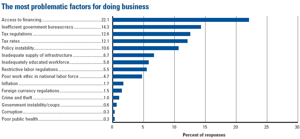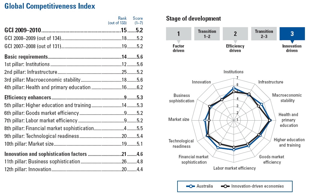 Великобритания продолжает входить в двадцатку стран-лидеров с высокими показателями индекса конкурентоспособности (5,2), хотя по сравнению с 2008-2009 годами в мировом рейтинге Великобритания упала на 1 пункт. По сравнению со средним уровнем развития (ведущие инновационные экономики), страна имеет лучшие показатели по следующим показателям: эффективность рынка товаров и услуг, технологический уровень, размер внутреннего рынка, конкурентоспособность компаний, инновационный потенциал; уступает в следующих показателях: макроэкономическая стабильность. Ключевыми проблемными факторами, оказавшими влияние на индекс конкурентоспособности для Великобритании (максимальное количество процентов 30), оказались доступ к финансированию (22,1), неэффективная государственная бюрократия, налоговое регулирование, налоговые ставки и политическая неустойчивость. Факторы, оказавшие влияние на индекс глобальной конкурентоспособности для Австралии, представлены на рисунке 2.2.   Рисунок 2.2 – Факторы, влияющие на индекс конкурентоспособности