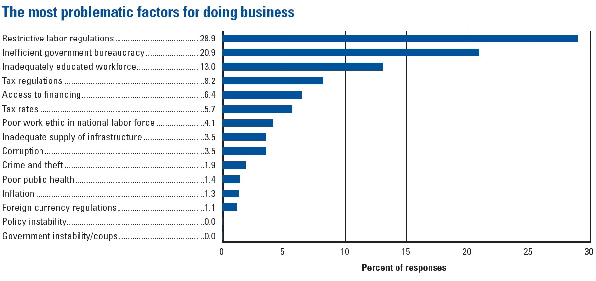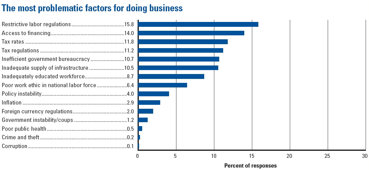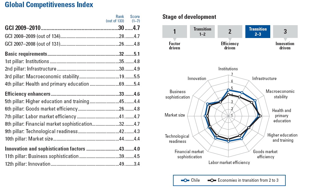 Австралия входит в двадцатку стран-лидеров с высокими показателями индекса конкурентоспособности (5,2), по сравнению с 2008-2009 годами в мировом рейтинге Австралия поднялась на 3 пункта. По сравнению со средним уровнем развития (ведущие инновационные экономики), страна имеет лучшие показатели по следующим показателям: качество институтов, макроэкономическая стабильность, высшее образование и профессиональная подготовка, эффективность рынка товаров и услуг, эффективность рынка труда, развитость финансового рынка, размер внутреннего рынка; уступает только по показателю конкурентоспособности компаний. Ключевыми проблемными факторами, оказавшими влияние на индекс конкурентоспособности для Австралии (максимальное количество процентов 30), оказались ограничение трудового регулирования (15,8), доступ к финансированию, налоговое регулирование, налоговые ставки и неэффективная государственная бюрократия. Факторы, оказавшие влияние на индекс глобальной конкурентоспособности для Чили, представлены на рисунке 2.3.   Рисунок 2.3 – Факторы, влияющие на индекс конкурентоспособности Чили входит в тридцатку стран с высокими показателями индекса конкурентоспособности (4,7), по сравнению с 2008-2009 годами в мировом рейтинге Чили поднялась на 2 пункта. По сравнению со средним уровнем развития (переходные экономические системы), страна имеет лучшие показатели по следующим показателям: качество институтов, инфраструктура, макроэкономическая стабильность, эффективность рынка товаров и услуг, эффективность рынка труда, развитость финансового рынка, размер внутреннего рынка и конкурентоспособность компаний; уступает только по показателю здоровье и начальное образование. Ключевыми проблемными факторами, оказавшими влияние на индекс конкурентоспособности для Чили (максимальное количество процентов 30), оказались ограничение торгового регулирования (28,9), неэффективная государственная бюрократия, неадекватно оформленная рабочая сила, налоговое регулирование. Проанализировав данные, можно сделать вывод о том, что Великобритания и Австралия примерно одинаковы по уровню конкурентоспособности. Великобритания превосходит Австралию по следующим показателям: технологический уровень, размер внутреннего рынка, конкурентоспособность компаний, инновации. Австралия превосходит Великобританию по следующим показателям: качество институтов, макроэкономическая стабильность, высшее образование и профессиональная подготовка, эффективность рынка товаров и услуг, развитость финансового рынка. Также легче всего открыть бизнес в Австралии, чем в Великобритании, так как практически все виды деятельности в Австралии лицензируются. Чили не значительно, но всё же отстает по некоторым показателям от сравниваемых стран. Хотя по оценке макроэкономической стабильности на 0,9 превосходит оценку макроэкономической стабильности Великобритании.