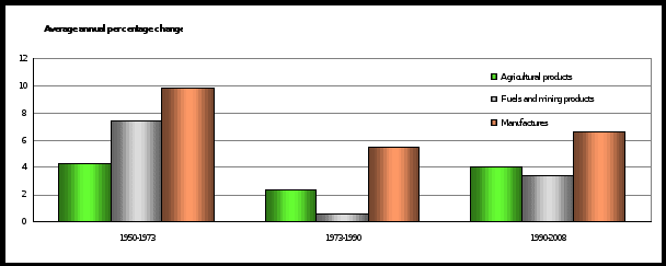 В период 2006-2008 годов мировой экспорт товаров составил 5% и продолжал снижаться: по сравнению с 2006 году на 3,5%. При этом рост объемов экспорта сельскохозяйственной продукции в 2008 году уменьшился в 2 раза и составил 2,5%. В росте объемов экспорта топлива и продукции добывающих отраслей, а также экспорта продукция обрабатывающих отраслей виден резкий спад в 2008 году – всего 0,7% и 2,2% соответственно. Рост объемов мирового производства в период с 2000 по 2008 годов в среднем составил 2,5%. Показатель снижался и в 2008 году достиг отрицательной отметки – 0,4%. Рост объемов производства сельскохозяйственной продукции в 2000-2008 годов был равен 2,5% и продолжал расти с каждым годом с максимальным приростом в 2008 году 2,8%. Рост объемов производства топлива и продукции добывающих отраслей в 2000-2008 годах в среднем составил 1,5%, в 2007 году приблизился к 0,1%, а продукции обрабатывающих отраслей – снизился всего на 0,5% и стал равен 5%. Рост объемов производства продукции обрабатывающих отраслей в 2000-2008 годах в среднем составил 2,5%, однако показатель падал с каждым годом, пик пришелся на 2008 г – падение производства – -1,3%. Рост мирового ВВП в 2000-2008 годах в среднем составил 3,0%, также наблюдается тенденция к снижению с пиком в 2008 году – рост составил лишь 1,7%. Данные о росте объемов мирового экспорта и производства товаров с 1950 по 2008 годы представлены в виде диаграммы (рисунок 3.1) [26].