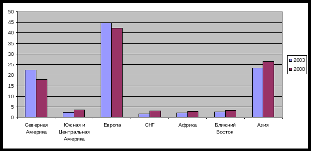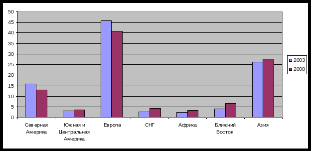 Структура мирового экспорта товаров представлена в таблице 3.2. Таблица 3.2 – Доля регионов в мировом экспорте и импорте товаров, % [26, 27] | № | Показатели регионы | Объем экспорта, млрд. долл. Удельный вес, % | Объем импорта, млрд. долл. Удельный вес, % | | 2003 | 2008 | 2003 | 2008 | | 1 | Северная Америка | 15,8 | 13,0 | 22,5 | 18,1 | | 2 | Южная и Центральная Америка | 3,0 | 3,8 | 2,5 | 3,7 | | 3 | Европа | 45,9 | 41,0 | 45,0 | 42,3 | | 4 | СНГ | 2,6 | 4,5 | 1,7 | 3,1 | | 5 | Африка | 2,4 | 3,5 | 2,1 | 2,9 | | 6 | Ближний Восток | 4,1 | 6,5 | 2,7 | 3,6 | | 7 | Азия | 26,2 | 27,7 | 23,5 | 26,4 | | 8 | Весь мир | 100,0 | 100,0 | 100,0 | 100,0 | Примечание: составлено автором [26, 27].