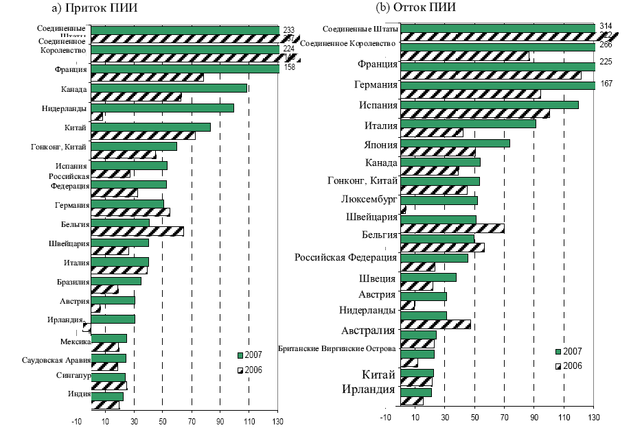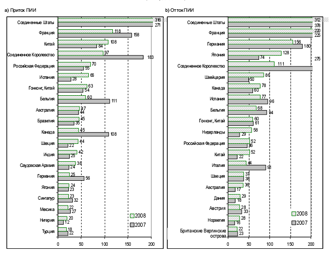 Как видно из рисунка лидирующее место по притоку ПИИ сохранила США, Франция заняла 2-е место среди ведущих принимающих стран, в то время как Соединенное Королевство опустилось на 4-е место. Значительно улучшили свое положение следующие страны: Китай, Россия, Бразилия, Индия, Японии, Турция, ухудшили свое положение: Нидерланды, Германия, Канада.   Рисунок 4.2 – Ведущие страны-инвесторы ПИИ, 20 ведущих стран, 2006–2008 годы (млрд. долл.) [28]