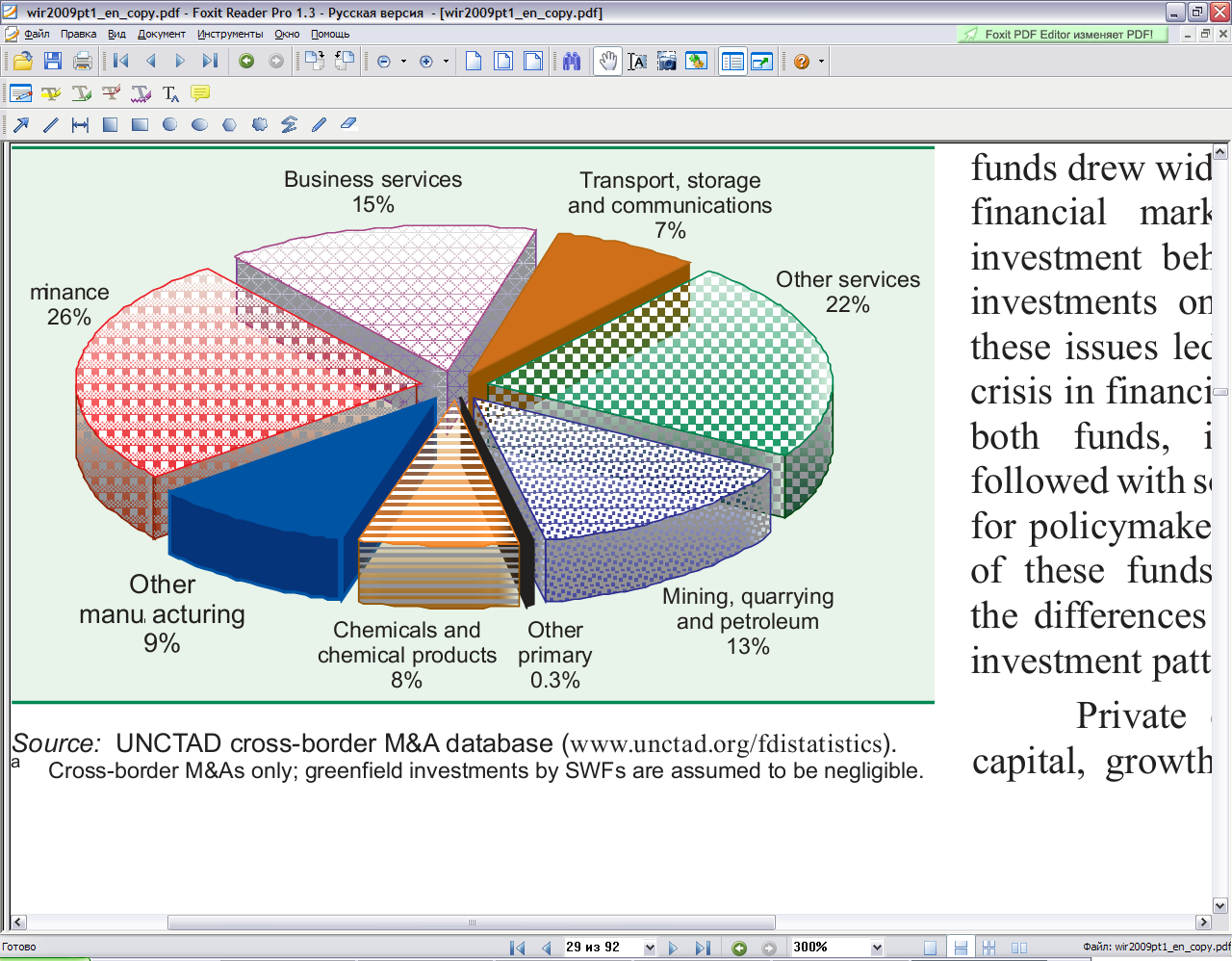 Как видно из рисунка лидирующее место по оттоку ПИИ сохранила США, Франция заняла 2-е место среди ведущих принимающих стран, в то время как Соединенное Королевство опустилось на 5-е место. Значительно улучшили свое положение следующие страны: Япония, Швейцария, Нидерланды, Дания, Норвегия, ухудшили свое положение: Испания, Италия, Ирландия. Отраслевая структура ПИИ представлена на рисунке 4.3 [28].  Рисунок 4.3 – Отраслевая структура ПИИ, 2008 год