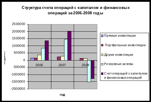 4.4 Анализ инвестиционной деятельности базовых стран Проанализируем платежный баланс Великобритании (счет операций с капиталом и финансовых операций) в таблице 4.8. Структура счёта операций с капиталом и финансовых операций представлена на рисунке 4.5. Таблица 4.8 – Финансовый счет Великобритании, 2006–2008 гг. (млн. долл.) [33] | Статьи | 2006 | 2007 | 2008 | | Счет операций с капиталом и финансовых операций | 1348775 | 2007803 | -1284500 | | I. Счет операций с капиталом | 6806 | 6537 | 7787 | | II. Финансовый счет | 1341969 | 2001266 | -1292287 | | 1. Прямые инвестиции | 146387 | 241678 | 124989 | | За границу | 69496 | 130335 | 72528 | | Во внутреннюю экономику | 76891 | 111343 | 52461 | | 2. Портфельные инвестиции | 354749 | 272129 | 111966 | | 2.1. Активы | 199118 | 96957 | -128620 | | 2.2. Обязательства | 155631 | 175172 | 240586 | | 3. Производные финансовые инструменты | -7449 | 19001 | -17746 | | 4. Другие инвестиции | 848708 | 1467267 | -1510158 | | 4.1. Активы | 393843 | 733234 | -580028 | | 4.2. Обязательства | 454865 | 734033 | -930130 | | 5. Резервные активы | -426 | 1191 | -1338 | Примечание: составлено автором [33].  Рисунок 4.5 – Структура счета операций с капиталом и финансовых операций Великобритании за 2006–2008 годы (млн. долл.)
