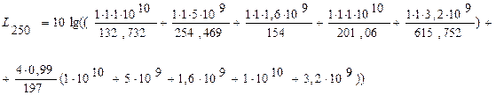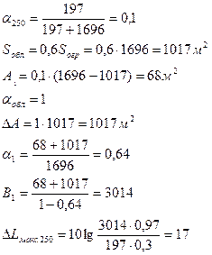 1. Найдем величину возможного максимального снижения уровня звукового давления в расчетной точке при применении выбранных звукопоглощающих конструкций при частоте 250 Гц.