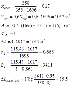 2. Найдем величину возможного максимального снижения уровня звукового давления в расчетной точке при применении выбранных звукопоглощающих конструкций при частоте 1000 Гц.